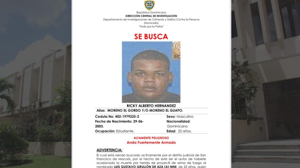 San Francisco de Macorís, Duarte.– La Policía Nacional identificó a Ricky Alberto Hernández, conocido como alias Moreno el Gordo o Moreno el Guapo, de 22 años, como el presunto autor vinculado a la pérdida de Luis Gustavo Grullón, alias Nini, de 23 años, en un hecho ocurrido frente al Palacio de Justicia de esta ciudad.