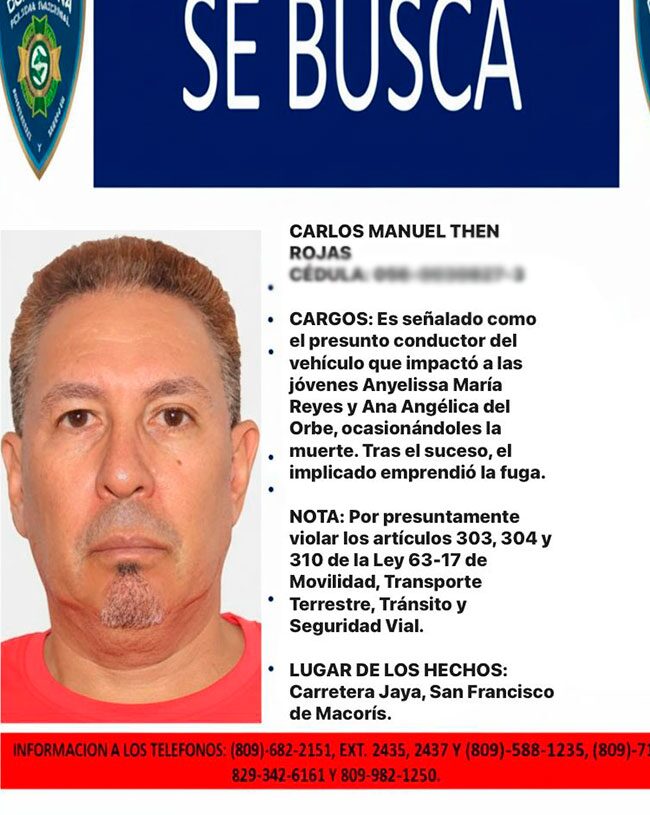 En continuación al caso del siniestro vial que cobró las existencias de dos bioanalistas en San Francisco de Macorís, la Policía Nacional emitió este lunes una orden de captura contra Carlos Manuel Then Rojas, identificado como el presunto conductor de la jeepeta que impactó a las profesionales de la salud.