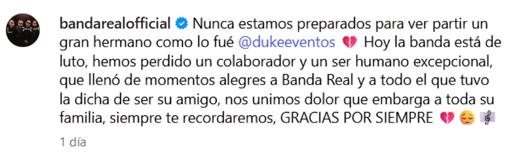 En el mensaje, la agrupación manifestó que “nunca estamos preparados para ver partir a un gran hermano como lo fue Duke Eventos. Hoy la banda está de luto, hemos perdido un colaborador que llenó de momentos alegres a Banda Real y a todo el que tuvo la dicha de ser su amigo”. Con estas palabras, la institución musical expresó públicamente su duelo y se solidarizó con la familia del colaborador.