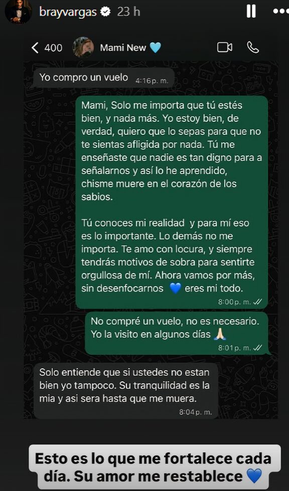 En una publicación realizada a través de sus historias de Instagram, Vargas expresó con énfasis que el bienestar de su madre constituye una prioridad esencial. Manifestó que su propósito es evitar que ella se vea afectada por comentarios o cuestionamientos derivados de la situación que se ha propagado en plataformas digitales y medios de comunicación.