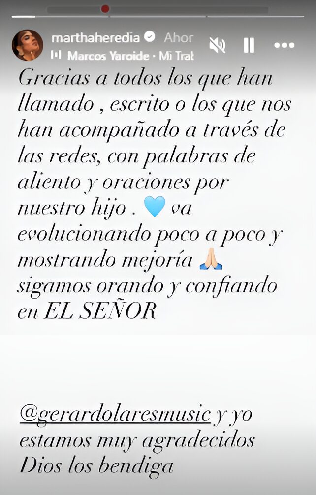 Aunque Martha no ofreció detalles específicos sobre la causa de las complicaciones, reiteró que confía en la recuperación total del pequeño y agradeció nuevamente el respaldo de quienes han estado pendientes.
