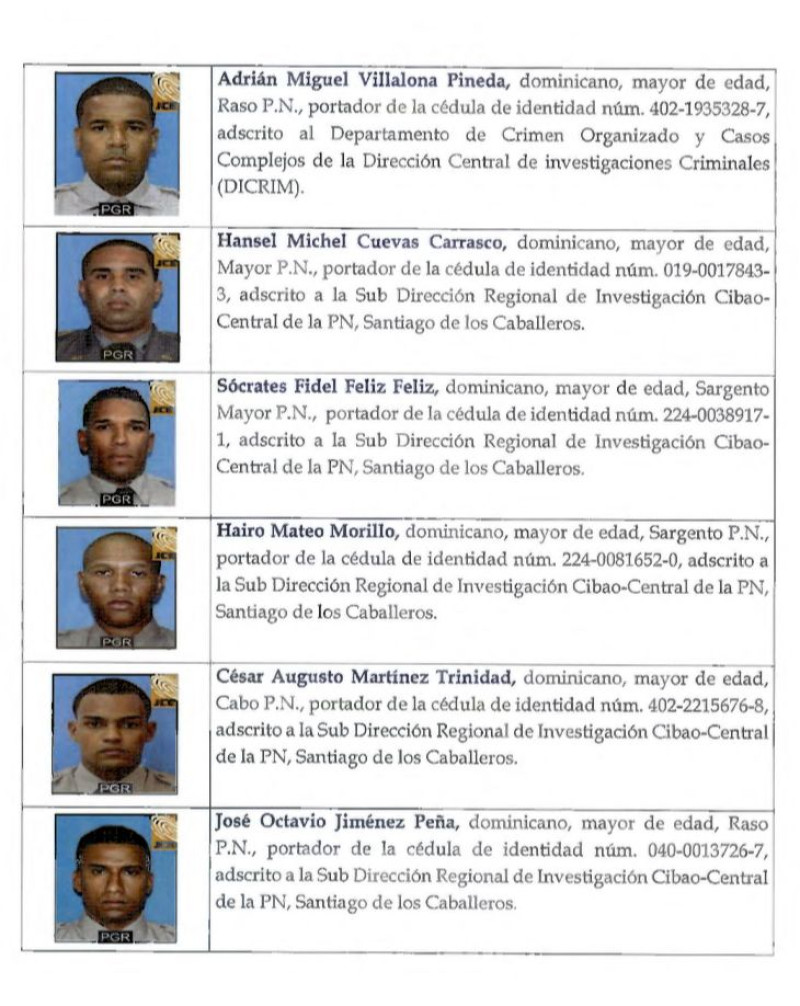 De acuerdo con la acusación, los señalados son el mayor Álvaro Paredes Paniagua, el capitán José Ignacio Gómez Rodríguez, el segundo teniente Domingo de los Santos, los cabos Yoandi Encarnación y Geiser Francisco Álvarez Rodríguez, y el raso Adrián Miguel Villalona Pineda, todos pertenecientes al Departamento de Investigación de Cr1menes Organizados y Casos Complejos. También figuran el mayor Hansel Michel Cuevas Carrasco, el sargento mayor Sócrates Fidel Félix Félix, el sargento Jairo Mateo Morillo, el cabo César Augusto Martínez Trinidad y el raso José Octavio Jiménez Peña, adscritos al DICRIM de Santiago.