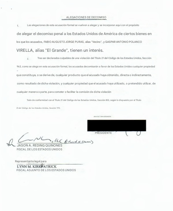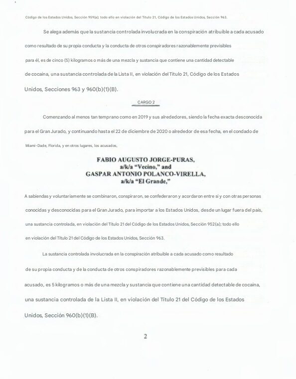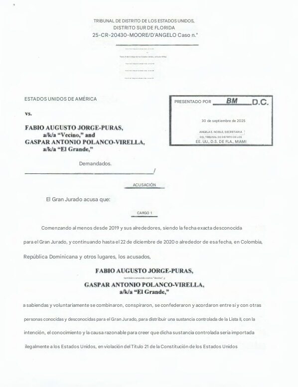 Un gran jurado federal del Distrito Sur de los Estados Unidos dispuso la apertura de juicio contra el asesor del Poder Ejecutivo, Fabio Augusto Jorge Puras, conocido como “Vecino“, y el exdirector de Servicios Públicos del Ayuntamiento del Distrito Nacional, Gaspar Antonio Polanco Virella, identificado como “El Grande“. Ambos ciudadanos dominicanos están acusados de integrar una red de tráfico internacional de sustancias ilícitas con destino a territorio norteamericano.