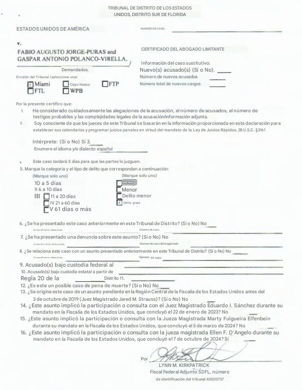 De acuerdo con los documentos judiciales emitidos el 30 de septiembre de 2025, bajo el expediente 25-CR-20430-MOORE/D’ANGELO, los acusados fueron imputados formalmente por los fiscales federales Jason A. Reding Quiñones y Lynn M. Kirkpatrick. Los fiscales los señalan de conspiración para distribuir e importar sustancias ilicitas hacia los Estados Unidos, en infracción al Título 21 del Código Federal estadounidense.