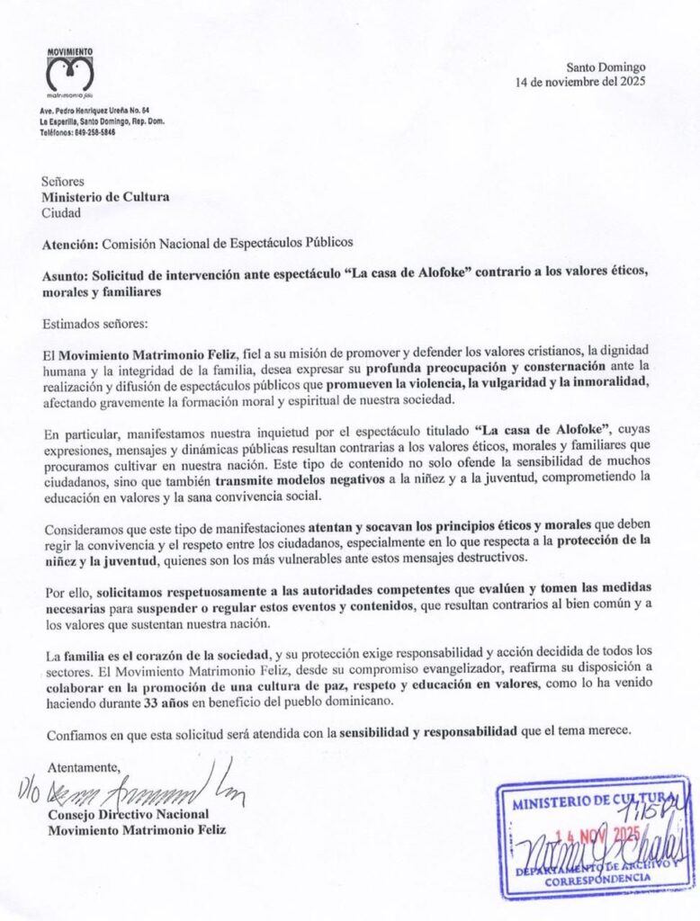 El Movimiento Matrimonio Feliz, organización con más de 33 años de labor enfocada en la familia y la formación en valores cristianos, hizo pública una solicitud formal dirigida al Ministerio de Cultura y a la Comisión Nacional de Espectáculos Públicos y Radiofonía. En dicha comunicación, la entidad pidió intervenir o cerrar el espectáculo denominado La Casa de Alofoke, al considerar que su contenido no se ajusta a los principios éticos, morales y familiares que, según su postura, sustentan la convivencia social. Esta solicitud fue expuesta mediante un documento enviado a las autoridades competentes.