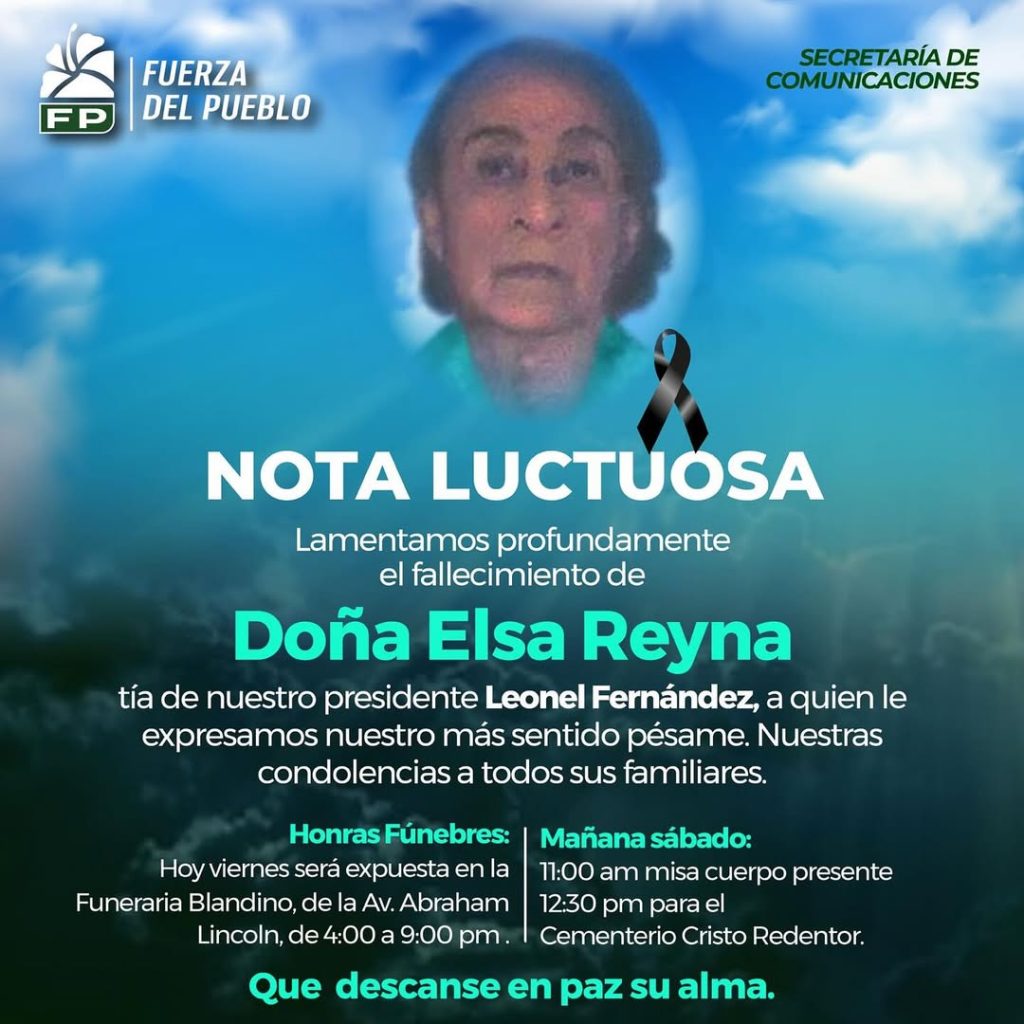 El partido Fuerza del Pueblo informó este viernes sobre el triste desenlace de Doña Elsa Reyna, reconocida familiar del expresidente Leonel Fernández, cuya trayectoria política mantiene un impacto histórico en la vida pública del país. La organización expresó su solidaridad con el exmandatario y todos los parientes de la señora Reyna, reafirmando acompañamiento institucional en este momento sensible.