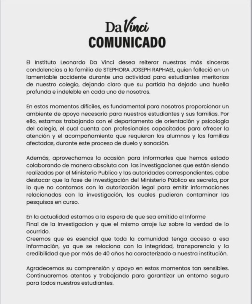 El Instituto Leonardo Da Vinci confirmó que la investigación sobre la estudiante Stephora Joseph Raphael sigue bajo total reserva del Ministerio Público, aumentando la inquietud entre padres.