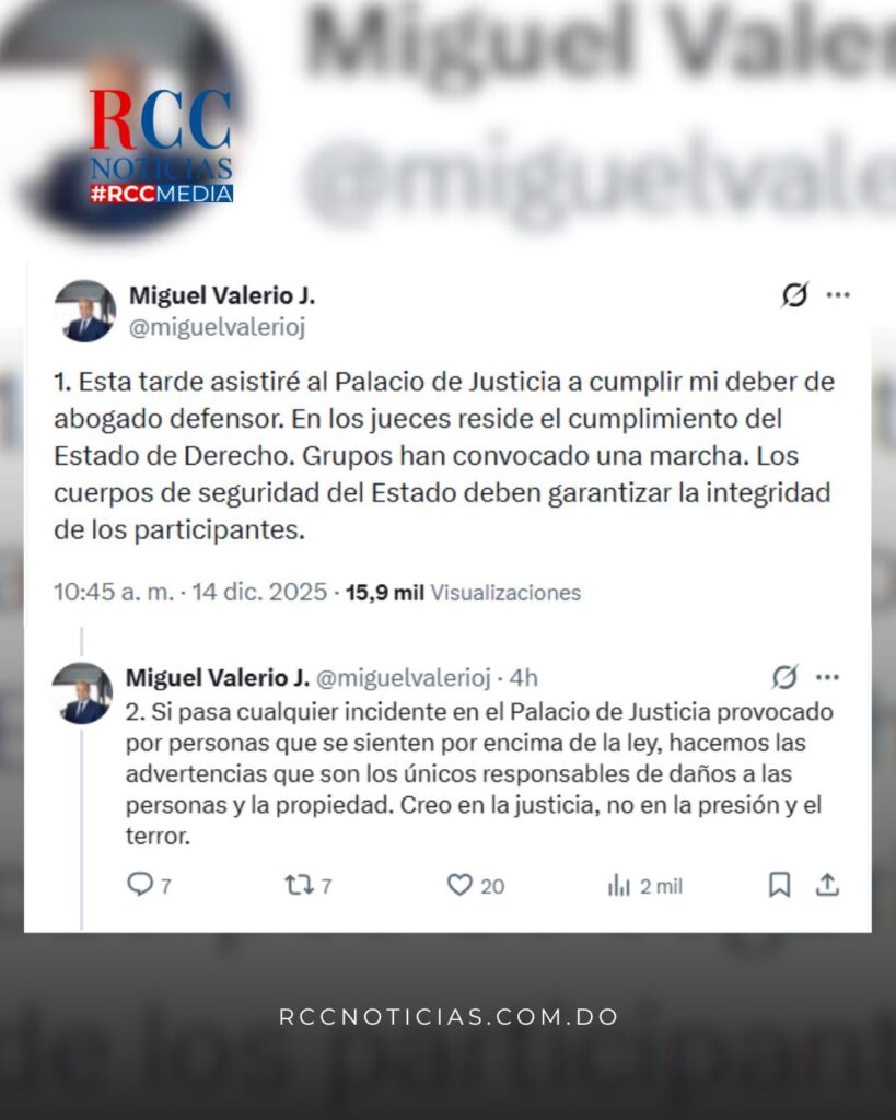 Valerio había indicado que asistiría al Palacio de Justicia para cumplir con su deber como abogado defensor, recordando que en los jueces reside el cumplimiento del Estado de Derecho.