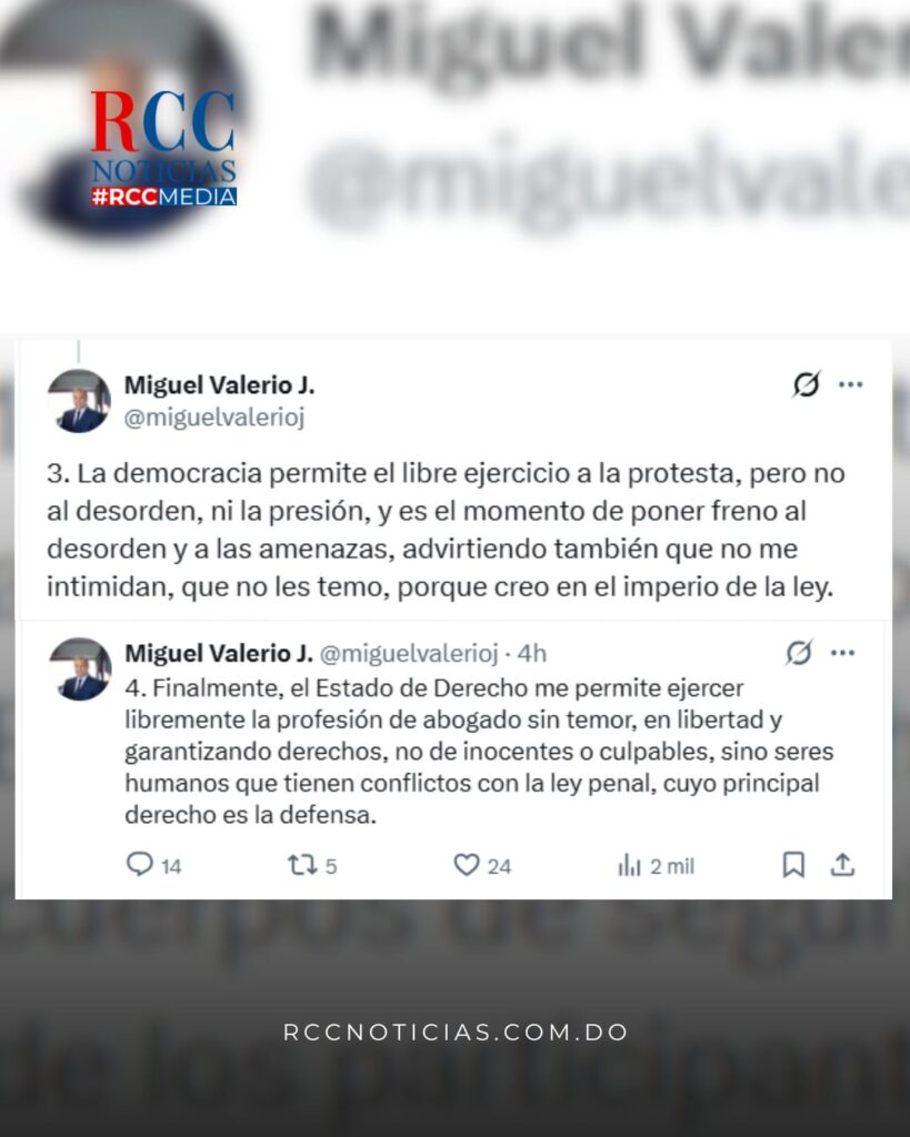 Valerio aseguró no sentirse intimidado y recalcó que continuará ejerciendo la abogacía bajo el amparo de la ley y del derecho fundamental a la defensa en cualquier circunstancia.
