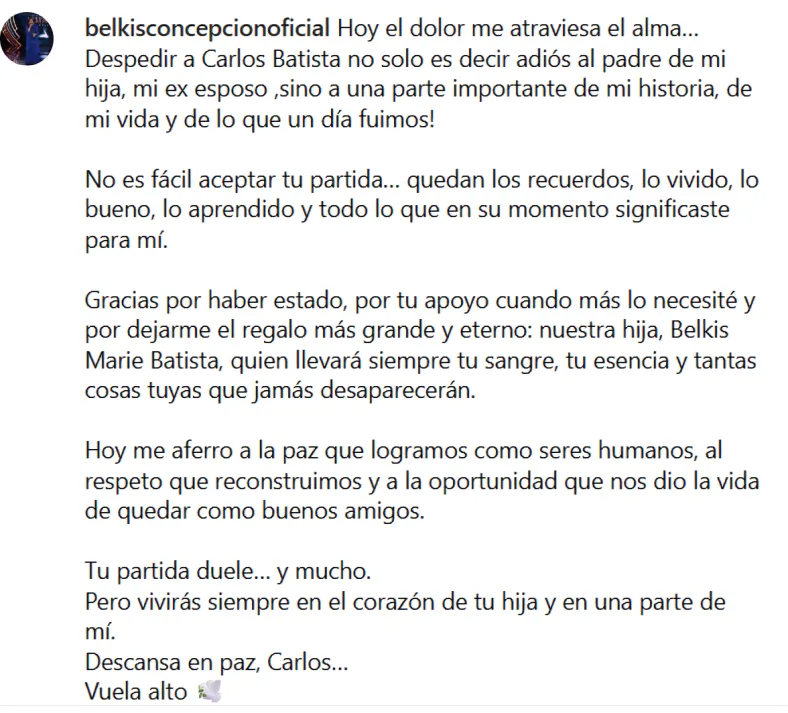 “Hoy el dolor me atraviesa el alma… despedir a Carlos Batista no solo es decir adiós al padre de mi hija, mi exesposo, sino a una parte importante de mi historia”