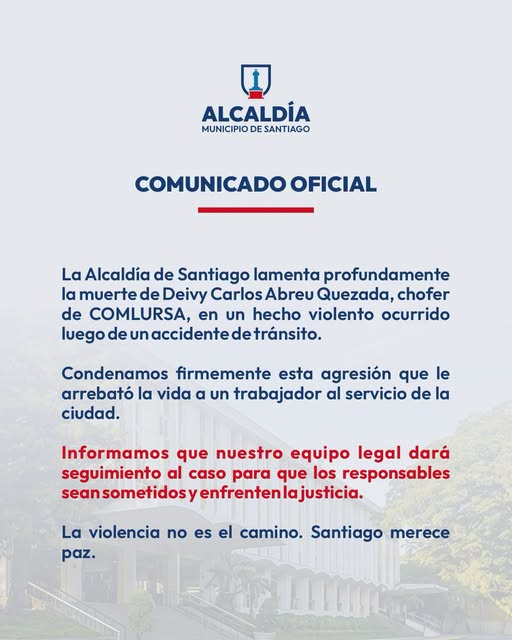 La Alcaldía de Santiago manifestó su pesar por el fallecimiento de Deivy Carlos Abreu Quezada, colaborador de la empresa Compañía de Limpieza Urbana (COMLURSA SRL).