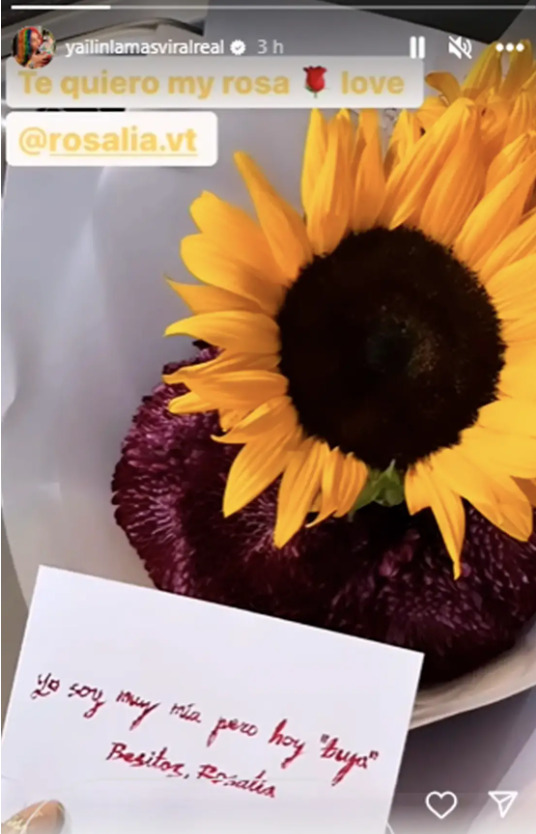 Yailin compartió a través de sus redes sociales el ramo de flores, el cual contenía una carta que decía: «Yo soy muy mía, pero hoy tuya. Besitos, Rosalía», en donde demostró su agradecimiento ante hermoso detalle.