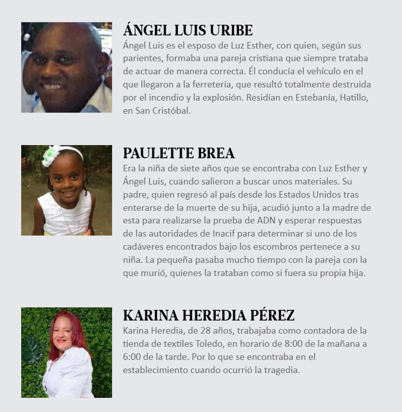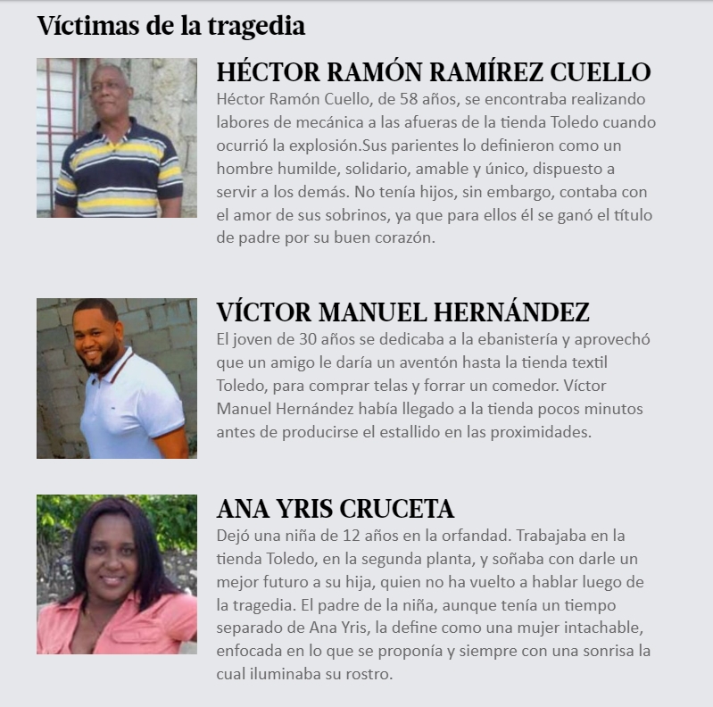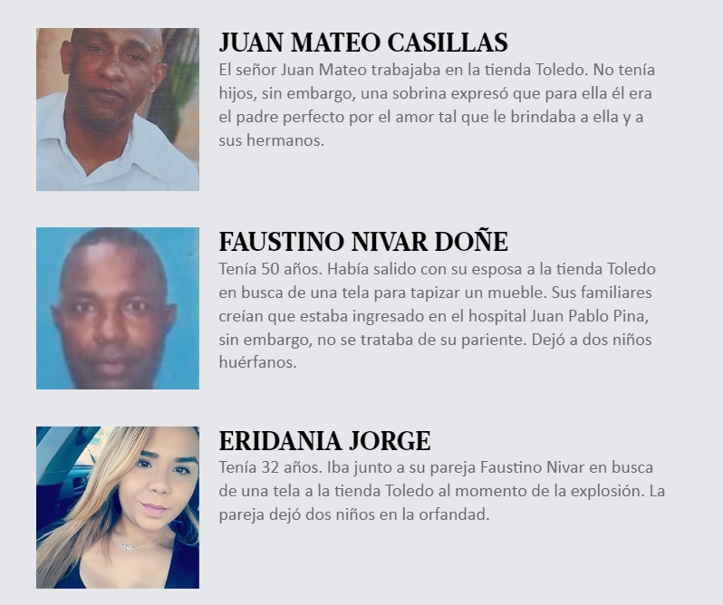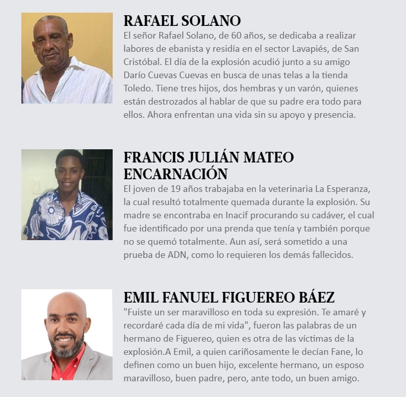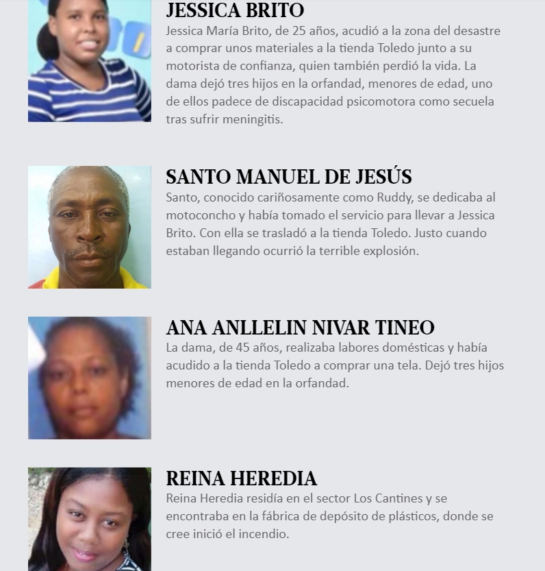 Todo nombre tiene detrás una historia, también los de las 32 personas que, según confirmaron las autoridades, fallecieron a causa de la explosión ocurrida el pasado lunes 14 de agosto en San Cristóbal, la cual truncó una tarde normal y la convirtió en un infierno de fuego, pesar y dolor.