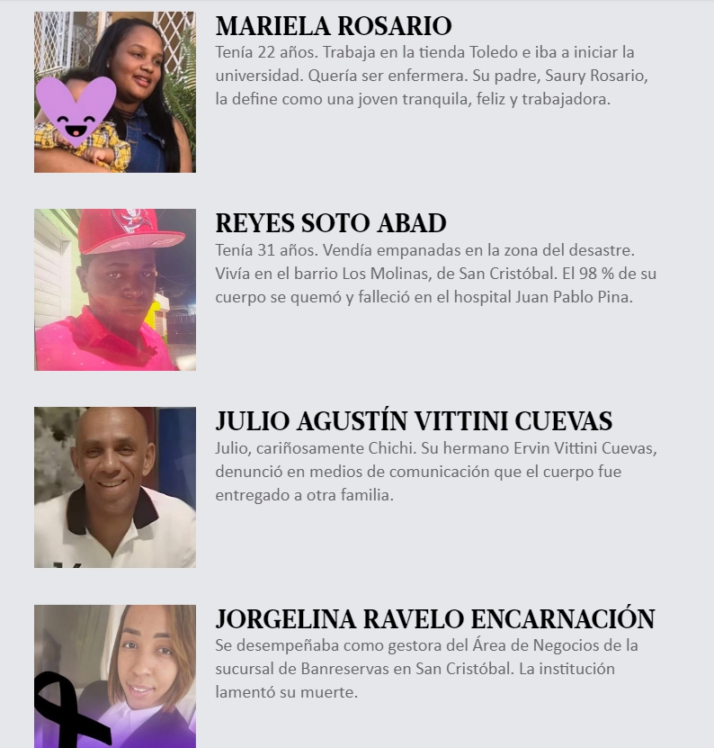 Entre los fallecidos hay menores de edad, también padres y madres que dejaron a sus hijos huérfanos. Diario Libre les puso rostro a 22 nombres de las 32, cada una con una historia que se truncó, se las compartimos.