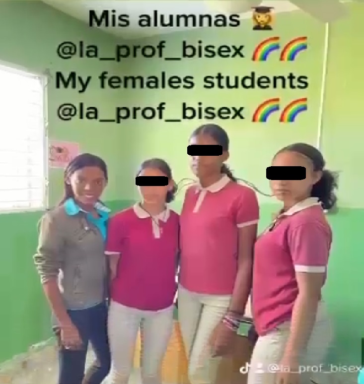 La maestra imparte docencia en el liceo Francisco del Rosario Sánchez, del municipio El Factor, en la provincia María Trinidad Sánchez y fue denunciada por la madre de una de jovencitas que aparece en la fotografía que circula en las redes sociales.